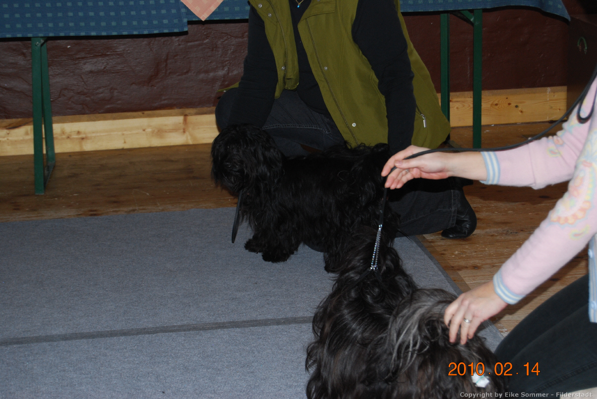 Nach dieser Bewertung meinte Bettina, dass wir jetzt die Zuchtzulassung beantragen könnten. Also meldete sie mich zur Ausstellung in Meitingen und der angeschlossenen Zuchtzulassungsprüfung an. Bei der notwendigen ärztlichen Untersuchung auf Patellaluxation und Katarakt wurde festgestellt, dass alles in Ordnung ist bei mir. Die Zuchtzulassungsprüfung habe ich natürlich mit links absolviert. Ich bin eindeutig größer als Loona und Roxy: meine Schulterhöhe liegt bei 26,5 cm. Und dass ich temperamentvoll sei, das muss mir doch keiner zweimal sagen.